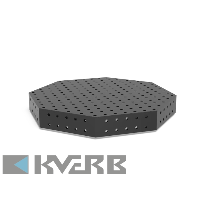 Welding table SW 1500x200 with plasma nitriding is advanced equipment for use in robotic welding systems. The design ensures maximum precision and reliability in clamping and securing workpieces. The octagonal shape and holes located on nine surfaces make the table versatile for various welding operations. Thanks to plasma nitriding, it gains increased wear resistance and durability, which is especially important for intensive use.