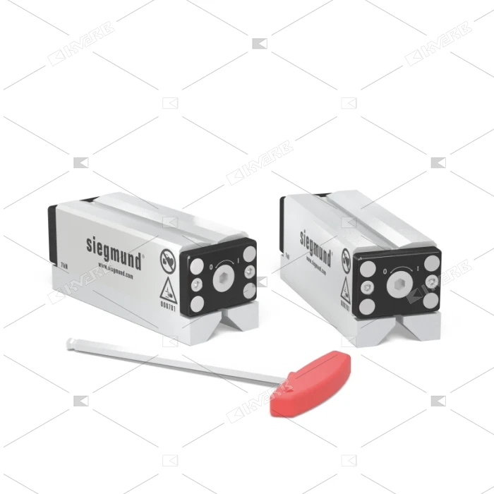 Двусторонние магнитные блоки имеют две магнитные стороны и предназначены для закрепления заготовок на стальных поверхностях, таких как сварочно-сборочные столы. Несколько магнитных зажимных блоков могут быть соединены друг с другом через внутренний шестигранник, чтобы зафиксировать заготовки большего размера. Активация магнита осуществляется поворотом съемного переключателя. Поверхности двустороннего магнитного блока никелированы. Две магнитные зажимные стороны блока могут использоваться для фиксации заготовок практически любой геометрии: трубы, листы или даже профили. Двусторонний магнитный блок - это оптимальное устройство для быстрого, универсального зажима, позволяющего избежать ограничений при сварке, сверлении, снятии заусенцев или нарезания резьбы.