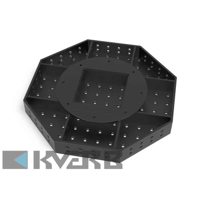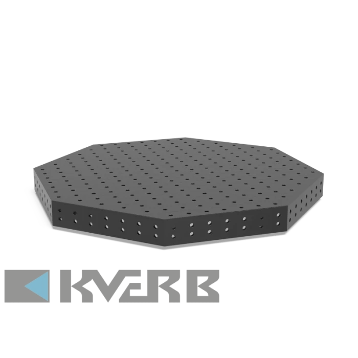 Сварочный стол SW 1700x150 с плазменным азотированием – восьмиугольная модель, предназначенная для работы в манипуляторах и роботизированных производственных системах. Обеспечивает точную фиксацию заготовок благодаря решётчатой структуре отверстий, аналогичной сварочным столам системы 22. Используется в задачах, где важны стабильность, точность и надёжность.