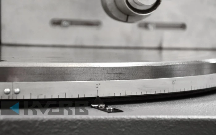 Станок оснащений обертовим столом, який синхронно обертається з полотном, що дозволяє різати з двох сторін в діапазоні від -60° до 60°. Оператор вручну регулює кут різу, використовуючи шкалу для точності. Висота різу налаштовується з панелі управління. Стол оснащений регульованими опорними щелями для стабільності матеріалу. Система відведення пилу підтримує чистоту робочого місця.