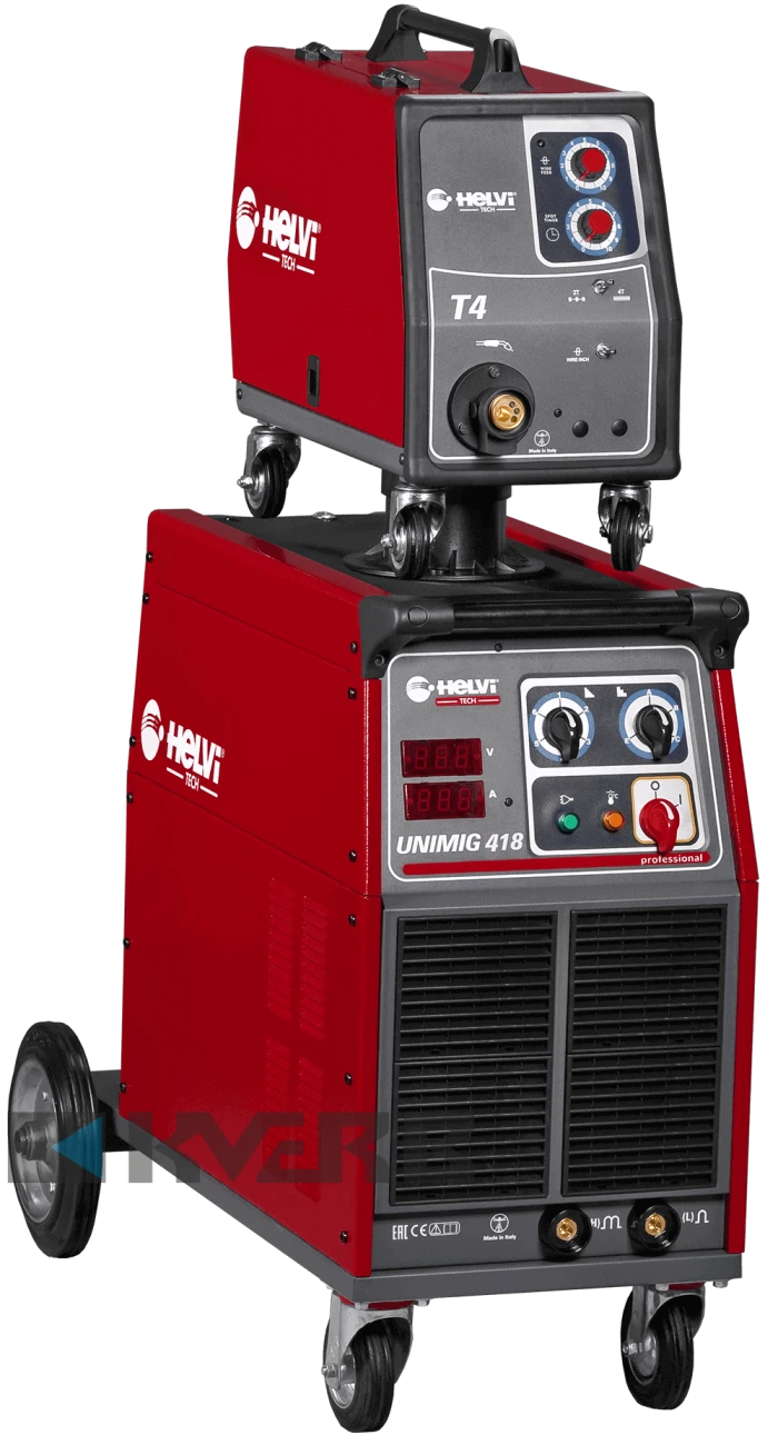 Helvi Unimig 418+T4 застосовується у виготовленні металевих конструкцій, механічних деталях і ремонтних роботах. Він підходить для зварювання сталі, нержавіючої сталі та алюмінію.